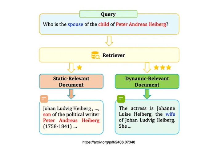 DR-RAG是一个两阶段的检索流程,专注于通过在问答数据集上执行多跳过程仅调用一次大型语言模型(LLM)。这种方法表明可以在答案的准确性上实现显著的提升。研究发现,在检索过程中,需要选择对生成答案具有高度相关性和决定性影响的文档。这些文档被称为静态相关文档。同时,还存在一些相关性较低但对答案生成过程至关重要的文档。这些文档被称为动态相关文档。如下方图表所示,示例查询“彼得·安德烈亚斯·海伯格的孩子的配偶是谁?”