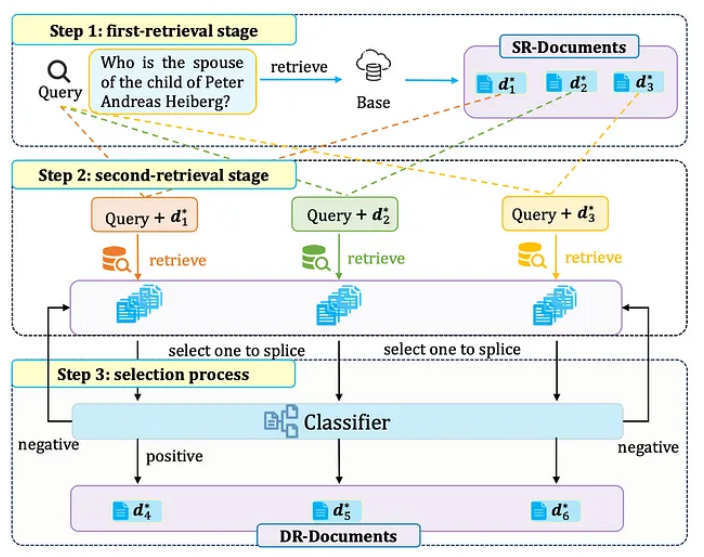 - 步骤3:单独选取每个DR-文档,并将其与查询和SR-文档结合。将这些组合输入到分类器中,以确定最相关的DR-文档。
