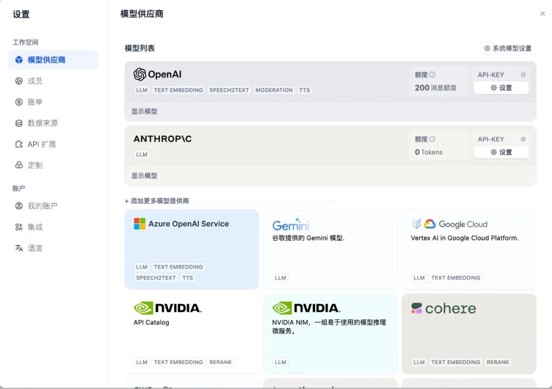 2. 可用模型:Coze能够支持的LLM是固定的,不可更改,而且海外版与国内版存在差异。Dify支持几乎所有主流国内外模型,只需要配置好模型供应商提供的API Key。