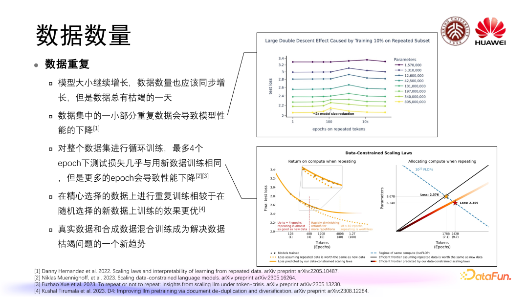 我们都知道随着大语言模型对数据的需求规模越来越大,会碰到一个数据枯竭的问题,尤其在一些领域中数据是有限的,为了解决数据枯竭和数据有限的问题,大家很自然就想到是不是可以对数据进行一些重复性训练。