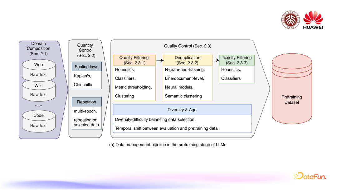 我们这里定义的数据管理是指使用收集到的数据组织一个合适训练数据集的过程,包括数据的选择、组合、使用策略,以及各种策略的评测方式。具体涉及两个阶段:一个是预训练阶段,一个是 SFT 阶段,每个阶段根据数据集构建的特点会包括不同的方面。下面将分别展开介绍。