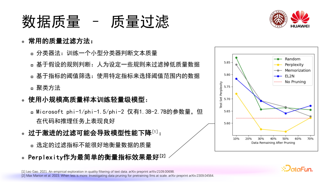 有工作去研究到底怎样衡量数据质量指标是更好的,在这个工作当中选用了三个我们比较常用的衡量指标,比如 Memorization(记忆)、EL2N、Perplexity,实验结论发现 Perplexity 作为最简单的衡量指标效果最好。