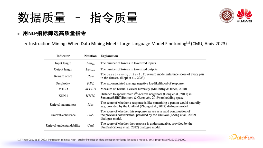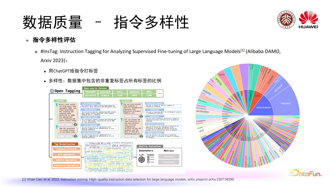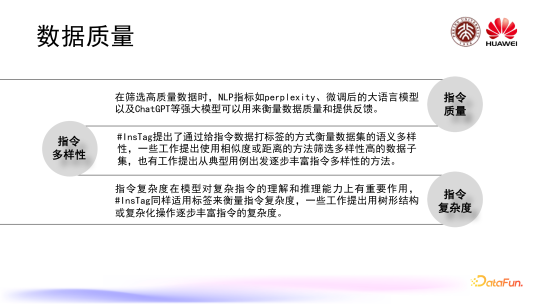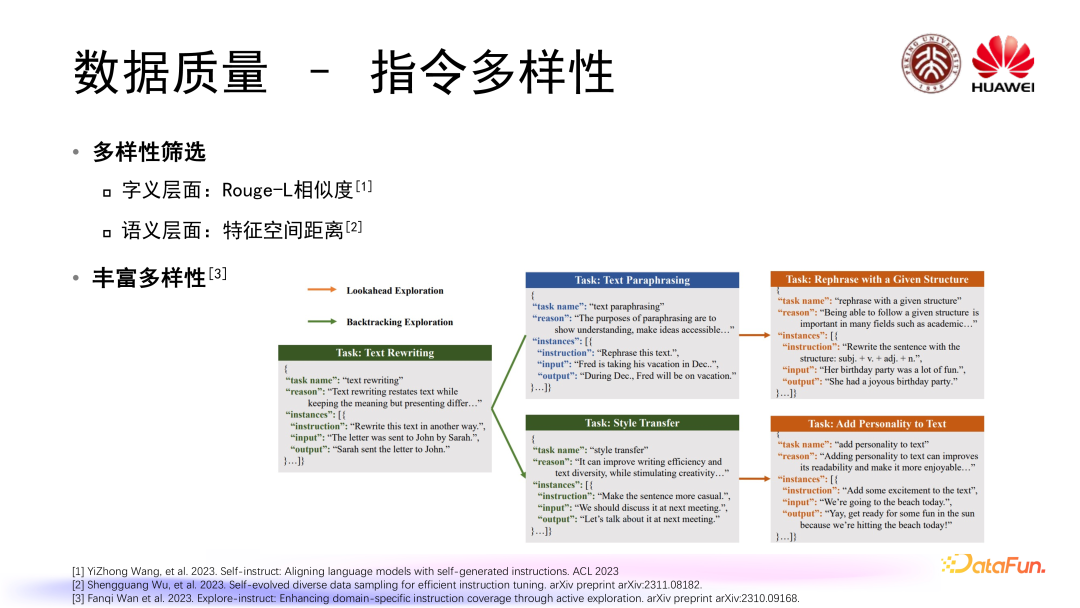 在多样性筛选方面,如果想要筛选出一个多样性比较高的SFT微调数据集,我们可以从字义的层面去筛选,可以使用 Rouge-L 相似度,也可以从语义层面筛选,比如看数据的 embedding 在特征空间上的距离,筛选出特征空间上距离相对较远的一些数据。数据有限或者多样性有限的情况下,我们也可以采取一定的操作去丰富数据的多样性,比如可以从一个基础指令出发,通过指令空间上的 lookahead 去看这个指令能否进一步深化,或者可以从当前的指令出发去看它有没有其他更多的变种来去探索指令上的空间,丰富指令数据的多样性。