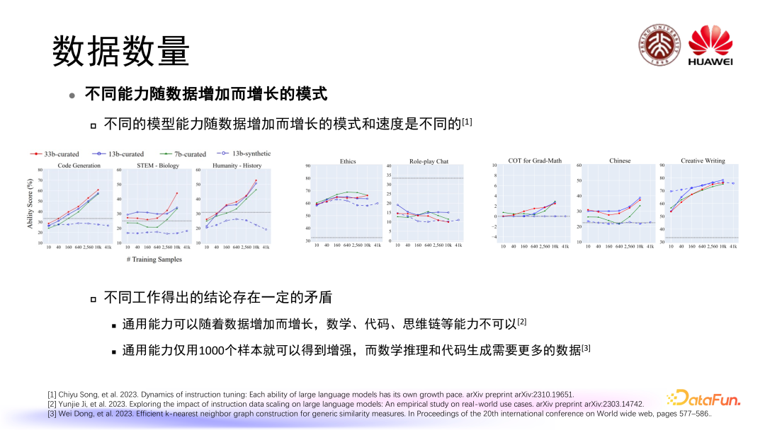 有工作研究了模型在学习不同任务或者不同能力时模型性能随数据增加而增长的模式,发现不同模型能力随着数据增加而增长的模式和速度是不同的,甚至可能出现一些非常不一样的情况。在这一问题上,目前的相关研究得出的结论存在一定程度的矛盾,比如有工作认为通用能力可以随着数据增加而增长,但数学代码、思维链这些复杂能力不可以。与此同时,一些工作认为在通用能力上模型仅仅使用 1000 个样本就可以得到增强,但在数学推理和代码生成这些复杂任务上面,模型需要更多数据进行学习。