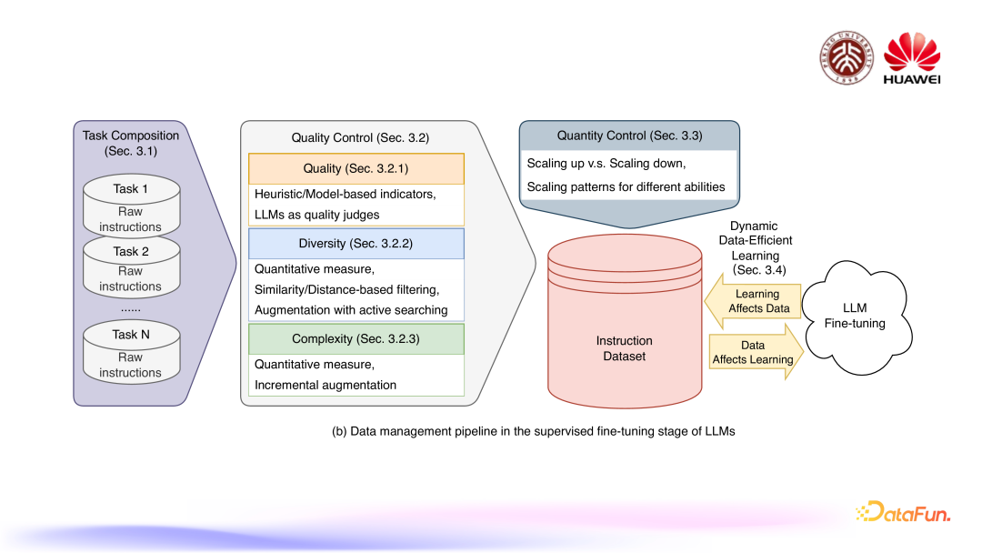 SFT 阶段的流程如上图,首先是任务组成,在对大语言模型进行 SFT 的时候,我们通常希望模型能够拥有处理多种任务的能力,所以我们会对它进行多任务的微调。质量控制是 SFT 数据管理的重中之重,这个质量包括指令指令质量,指令多样性以及指令复杂度。另外,对于数据集的数量也存在着一定的控制,也就是需要多少 SFT 数据能够让模型的微调效果达到比较好的程度。最后我们构建这个指令数据集的时候也会和大语言模型的微调训练的过程进行一定程度的结合,催生出一些动态数据高效学习的研究。