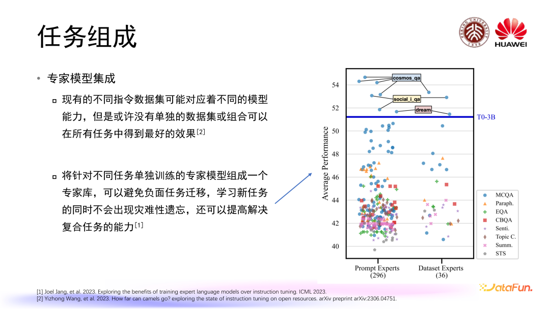 除了多任务微调这样的设定,有研究表明现有不同的指令数据集可能对应着不同的模型能力,并且可能没有单独的数据集或组合可以在所有任务中得到最好的效果。因此,有工作提出将针对不同任务单独训练的专家模型组成一个专家库,并认为这样可以避免负面任务迁移,在学习新任务的同时不会出现灾难性遗忘,也可以提高解决复合任务的能力,这也为我们使用大语言模型去解决多任务提供了一个新思路。