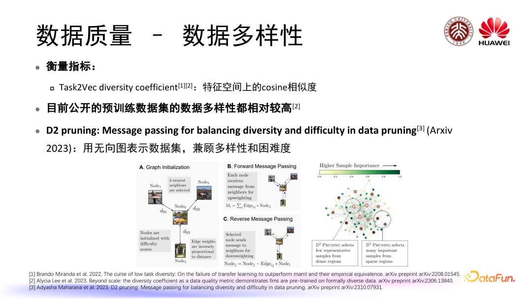 用这一指标进行衡量可以得知目前公开的预训练数据集的数据多样性都相对较高。近期也有一些工作针对数据多样性进行预训练数据选择,比如 D2 pruning 用无向图表示数据集,采用 message passing 策略兼顾多样性和困难度。