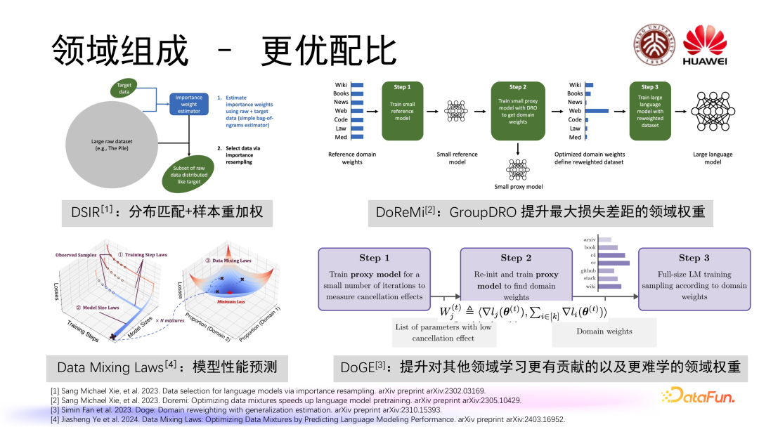 我们自然而然会关心到的一个问题是如何找到一个更优的领域配比。目前有一些工作在这一方面进行了探索,比如 DSIR 采用了一种样本重加权方式使构建出的预训练数据集和我们想要的目标数据集的分布更加一致;DoReMi 借鉴了 GroupDRO 的优化策略来提升有着最大损失差距的领域权重;相对而言 DoGE 更看重的是提升对其他领域学习更有贡献的以及更难学的领域权重,通过梯度方式计算出一个贡献量,进而增加相应领域权重;近期提出的 Data Mixing Laws 则通过拟合领域配比和模型性能的关系,对模型的性能做出一定程度上的预测。