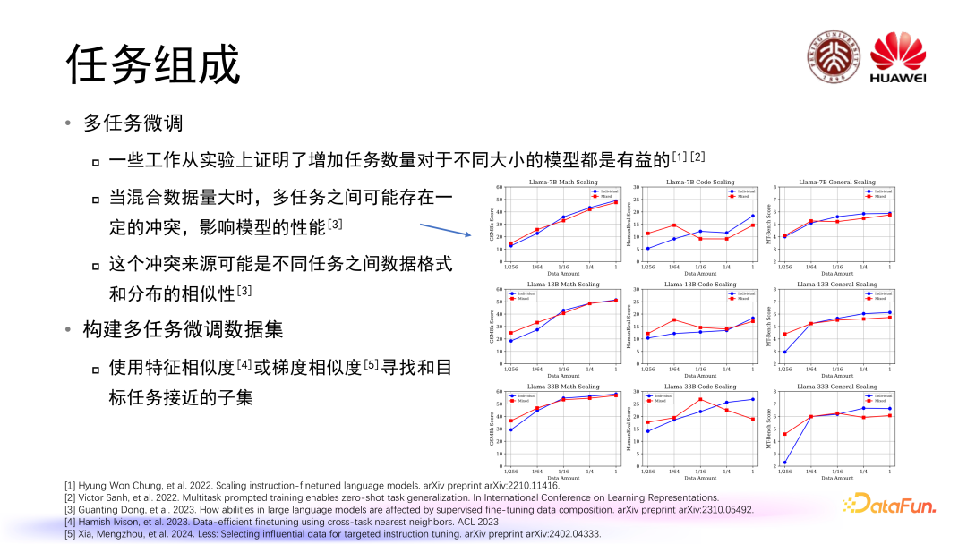 一些工作从实验上证明增加任务数量对于不同大小的模型都是有益的。当混合数据量大时,多任务之间可能存在一定的冲突影响模型的性能,比如模型在学习通用能力,代码能力,数学能力相关数据的时候会存在一定程度上的冲突现象。这个冲突来源可能是不同任务之间数据格式和分布的相似性,不同任务之间的数据格式和分布越接近越相似,他们之间产生冲突的可能性越大。构建多任务微调数据集也存在任务的配比和任务选择的一个问题。目前有相关研究使用了特征相似度或梯度相似度寻找和目标任务接近的子集。