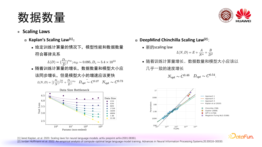 对大语言模型预训练来讲,大规模的数据是非常重要的。早期有研究者关注到数据数量和模型性能之间的关系,比较有名的就是上图中的两条 scaling laws。
