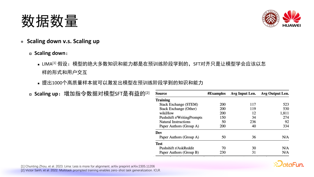 微调数据集数据量和预训练阶段存在一定不同,预训练阶段我们通常认为数据越多越好,比如说我们之前讨论 scaling law 是在更大规模模型上提升性能,我们需要更好更多的数据,但是 SFT 阶段通常所需的数据量并没有那么多。在这一问题上,相关研究出现两个分支:一个分支认为我们需要的数据量不在于多而在于精,比如 Lima 提出了一个假设认为模型绝大多数知识和能力都是在预训练阶段提到,而 SFT 对齐只是让模型学会应该以怎样的形式和用户进行交互,他们精心筛选出了 1000 个高质量、高多样性样本,通过实验,他们认为只要使用这 1000 个样本就可以激发出模型在预训练阶段学到这样的知识和能力。当然另外一个分支认为我们还是应该对指令数据集进行 scaling up,也就是增加指令数据对于模型的 SFT 是有益的。在这样两个分支的情况下,也有一些工作对于模型 SFT 所需要的数据数量进行了一些更加细化的分析。