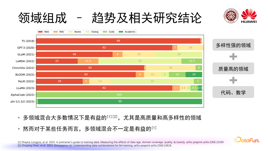 可以看到在早期的时候大家普遍采用的是多样性比较强的领域数据,比如 Web 网页数据。后面逐渐开始引入一些质量比较高的领域数据,比如 Wiki 百科、Books 数据。随着我们对大语言模型综合能力发展变化要求的提升,逐步加入了类似 Dialog 对话、Code 代码、Academic、数学等特殊领域的数据。我们知道多领域混合在大多数情况下是有益的,尤其是包含高质量和高多样性的领域数据,但是也有研究表明对于某一些任务而言多领域混合也不一定是有益的。