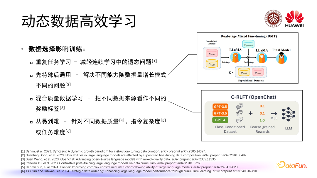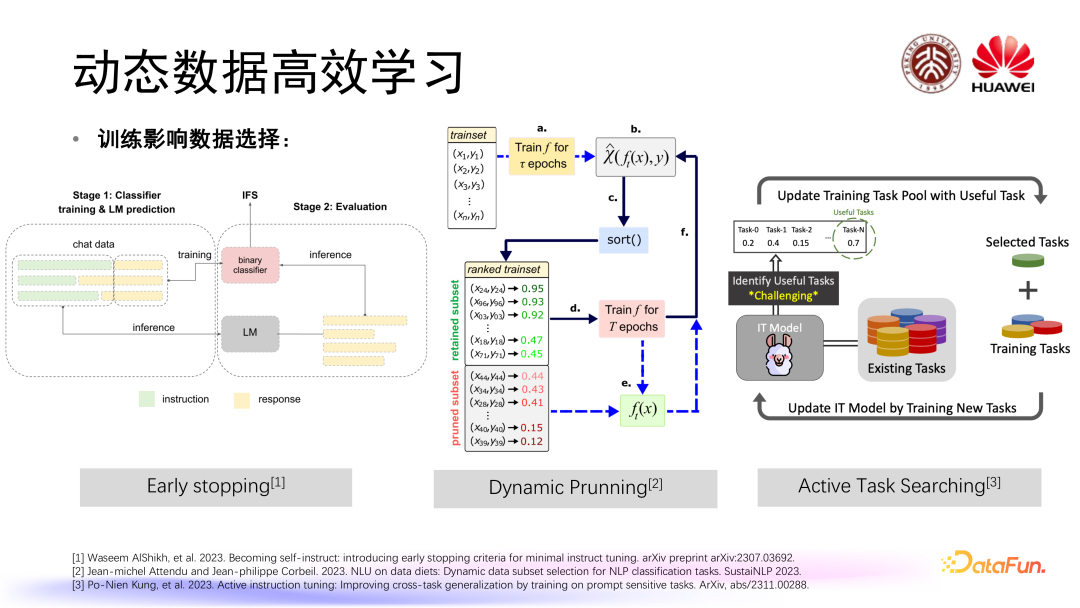 SFT 阶段还包括动态数据的高效学习。在SFT训练过程当中,模型对于数据的需求在不同阶段可能是不一样的,因此我们可以考虑动态地去调整和组织SFT微调数据。首先,训练可能会影响到数据选择,比如可以采取早停(Early stopping)这样的方式,也就是在模型训练过程当中在不同阶段去看模型的能力学习到了什么程度,如果达到预期,就可以进行早停,不需要过度学习。