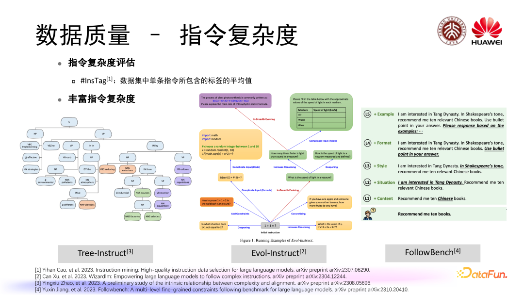 在指令复杂度上也涉及复杂度评估的问题,#InsTag 同样通过打标签这种方式给出了指令复杂度的定义,即指令数据集当中单条指令所包含的标签平均值,同样也有一些方法提出了我们怎样去基于现有的指令来丰富指令复杂度,比如 Tree-instruct 把指令转化成了一棵语义树,通过在语义树上增添节点的方式来达到可控指令复杂度丰富;Evol-instruct 采取了一些不同的操作,比如给这个指令增添图表等实现指令进化;FollowBench 通过对指令增加不同级别的限制条件来提升指令的复杂度。