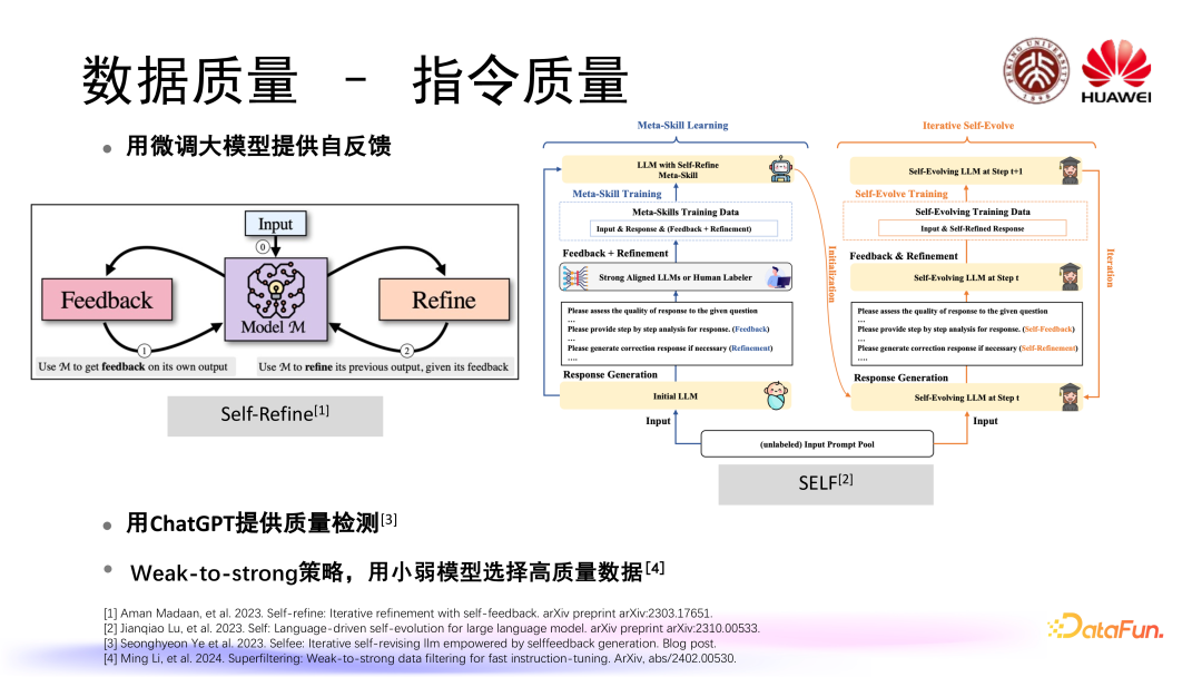 随着对大模型研究的深入,大模型本身可以为我们筛选高质量的数据提供一定参考。比如说有些工作会使用微调后的大模型提供自反馈,也就是让大模型自己对自己生成的指令和回答去进行一个反馈 feedback,通过迭代的方式不停的去优化自己所生成的指令以及指令的回答,同时我们也可以用现在已有的一些比如 ChatGPT 或者 GPT4 这样的强大语言模型来提供质量检测。近期有些工作提出了 Weak-to-strong 的策略,也就是用比较小比较弱的模型来选择高质量的数据以供这些大模型进行训练。