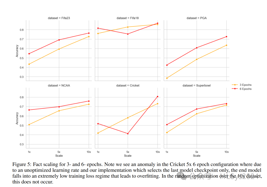 本研究在探讨SFT和知识注入时,采用了相同类型的数据集——关于体育赛事的维基百科文章。未来的研究可以通过纳入来自不同领域的多样化文本语料库来增强我们发现的稳健性。这不仅能验证我们方法的普适性,还能提高模型在更广泛知识领域中的适应性。在评估知识保留的有效性时,我们主要关注了体育相关内容中答案的正确性。然而,重要的是要考虑模型在更广泛主题上的表现,特别是在可能跨越多个领域的现实对话场景中。未来的研究应探讨新知识获取的权衡,尤其是对新知识的获取可能对模型在先前学习概念上的熟练度产生的潜在影响。我们对超参数调整和欠拟合可能性的初步探索取得了令人鼓舞的结果,观察到在增加训练轮次后,性能有了显著提升。我们尝试将轮次从3加倍到6,并再次在事实数据集上进行训练,结果如图5所示。在一些情况下,如PGA在10倍数据集时,或在NCAA在1倍数据集时,我们的评估集得分显著提高了高达10%或15%的绝对值。那么,我们所看到的扩展增益是否仅仅是因为更大的数据集等同于更长的训练时间,从而产生与延长训练轮次相同的效果?为此,我们比较了5倍数据集6轮次的结果与10倍数据集3轮次的结果,它们在训练成本上大致相等,但在扩展上有所不同。在所有六个数据集中,10倍数据集3轮次的配置均优于5倍数据集6轮次的配置,尽管在某些数据集中这一优势仅为3-5%。因此,我们的一些增益可能仅仅归因于更长的训练时间,但一致的超常表现让我们相信,通过不同问题进行的扩展也有其益处。尽管如此,数据集扩展、训练时长和学习效率之间的关系仍值得进一步探索。未来的研究应旨在明确数据集扩展与延长训练周期的具体贡献,同时考虑增加轮次可能带来的过拟合风险。
