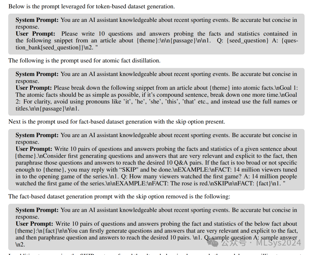 在基于事实的数据集生成提示中,我们给GPT-4一个选项,如果事实过于宽泛、不清晰或与文档主题不相关,则可以跳过问答对的生成。我们手动检查了模型选择遵循此选项的少数情况。如果这些原子事实确实与主题无关,则会被过滤掉;如果保留,则移除“跳过”提示选项并重新生成问答对。一个GPT-4选择跳过的事实示例是“俄罗斯是一个在与纳粹主义的斗争中损失了数百万生命的国家”,这是在俄罗斯举办的2018年国际足联世界杯文章中被提及的。原文中的一句话提到了这一点,但模型(正确地)认为这与体育赛事太过不具体,因此没有包含在内。另一个例子是,对于美式足球超级碗LVII的文章,GPT-4跳过了“2022年2月,超过200名自由派宗教领袖向NFL专员罗杰·古德尔请愿”这一事实,尽管它看似与主题关系不大,但确实涉及了一些要求更改超级碗LVII举办地的呼声。我们仍然为这一事实生成了问答对。基于事实的评估集是在接受的原子事实集上,使用不带跳过选项的提示生成的,经过精确匹配标准的去重处理,并保持在1倍规模。