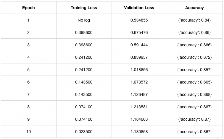 # import accuracy evaluation metricaccuracy = evaluate.load("accuracy")# define an evaluation function to pass into trainer laterdef compute_metrics(p):    predictions, labels = p    predictions = np.argmax(predictions, axis=1)