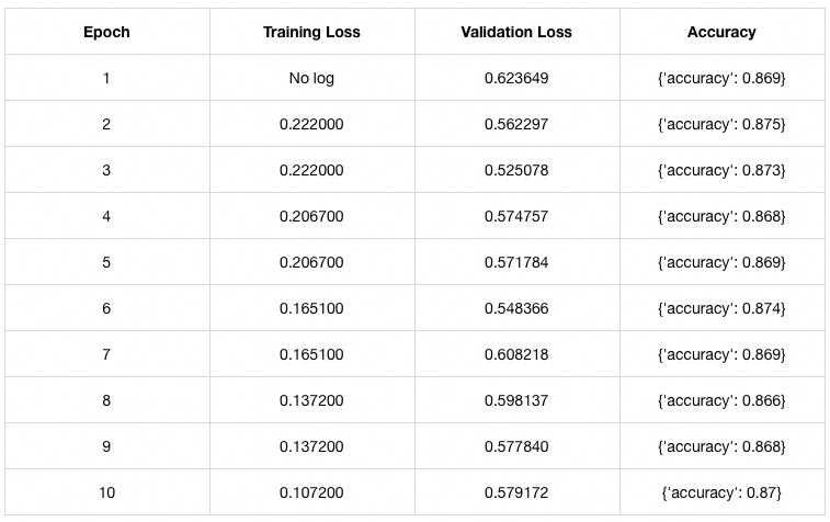 from transformers import Trainer# creater trainer objecttrainer = Trainer(    model=model,    args=training_args,    train_dataset=tokenized_dataset["train"],    eval_dataset=tokenized_dataset["validation"],    tokenizer=tokenizer,    data_collator=data_collator, # this will dynamically pad examples in each batch to be equal length    compute_metrics=compute_metrics,)