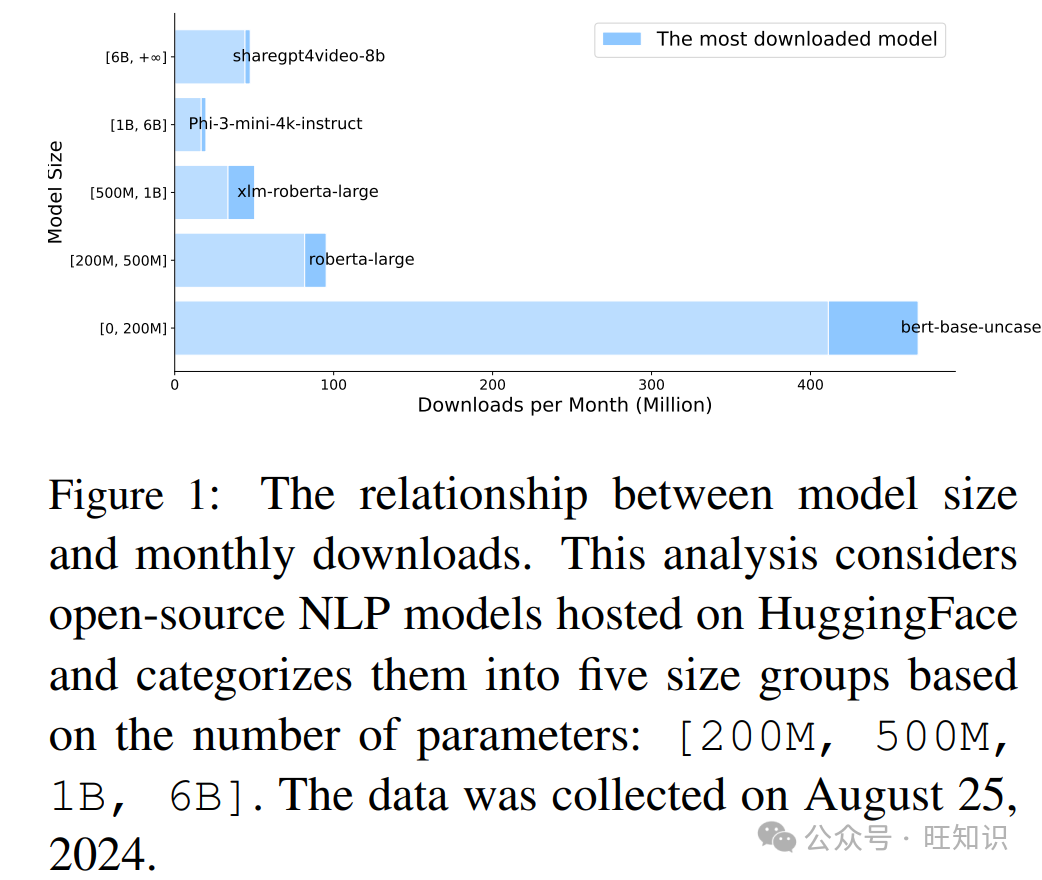 有人可能会认为像Phi-3.8B和Gemma-2B这样的模型不能算作真正的小型模型,而像BERT这样的真正小型模型已不再突出。然而,我们的发现表明,在实际应用中小型模型的使用被大大低估了。如图1所示,我们分析了HuggingFace上各种大小的开源模型的下载数量。结果显示,尤其是BERT-base这样的小型模型仍然非常受欢迎。这引发了关于LLMs时代小型模型角色的重要问题,这是以往研究中很少关注的话题。