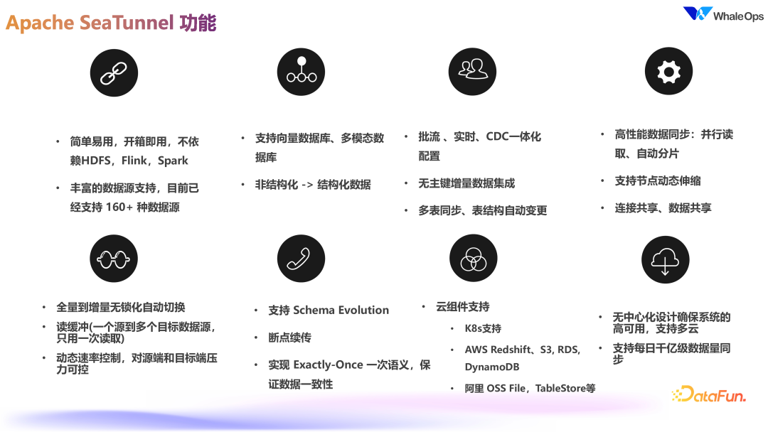 多功能数据同步:SeaTunnel 支持自动建表和多表同步,且具备断点续传的能力,确保数据在中断后可以从上次的位置继续处理。同时,它为批处理和流处理的融合提供了支持,以应对近年来批流一体的趋势。