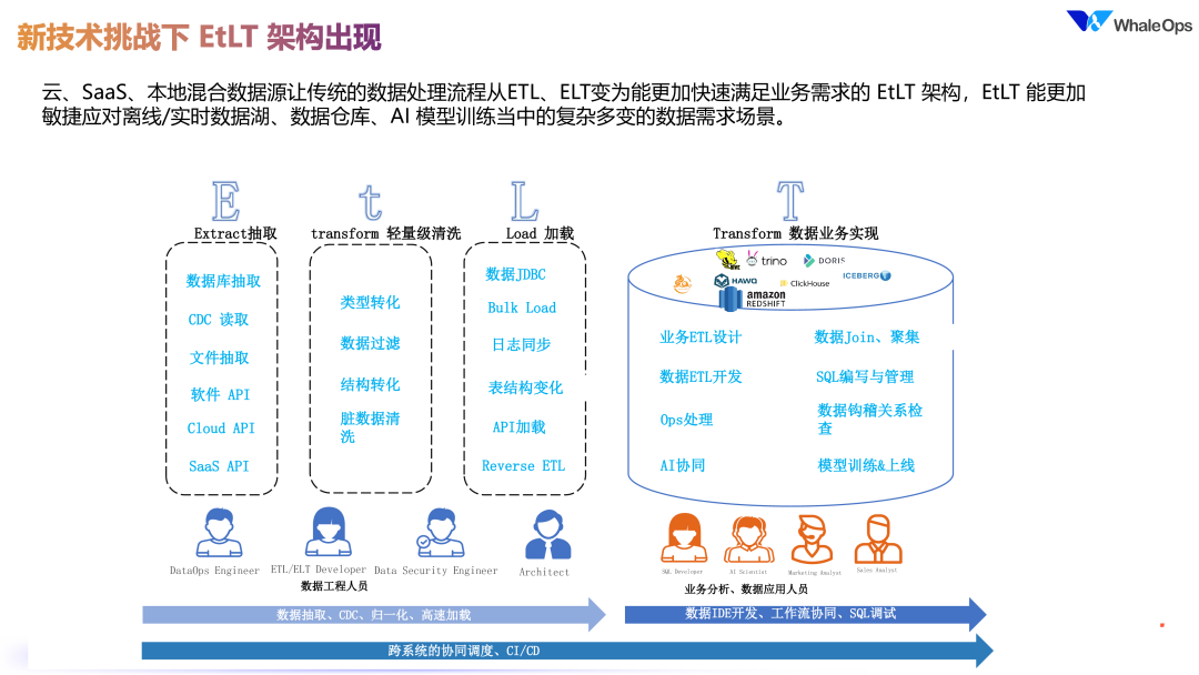各类数据引擎在加载数据时的方式也因架构变革而多样化。例如,Doris 需要 stream load 模式,Redshift 则采用 copy 文件模式,以提高数据加载效率。在 EtLT 架构中,由于每秒需同步大量数据到数据湖或数据仓库,传统的 JDBC 方式显然已无法满足需求。EtLT 架构的这些创新设计,使其更好地适应了实时数据仓库、AI 训练等场景的高效数据处理需求,与传统 ETL 相比,展现出更大的灵活性和实时性。