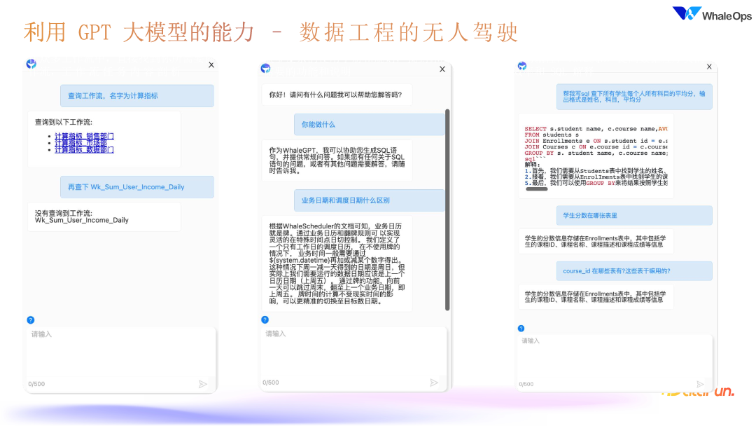 比如,现在可以直接查询 GPT 作为知识库的一部分。通过 RAG 技术,用户可以输入需求,比如“计算市场部门的每天销售额”,GPT 会自动找到对应表并返回数据。此外,还可进行知识问询,例如了解数据依赖、业务日历等概念,这些日常问询基本能够满足业务需求。