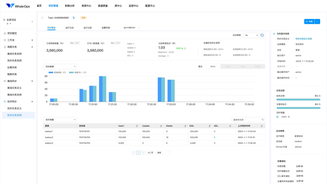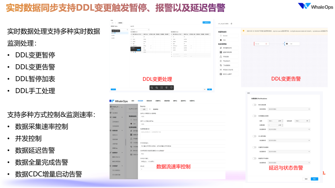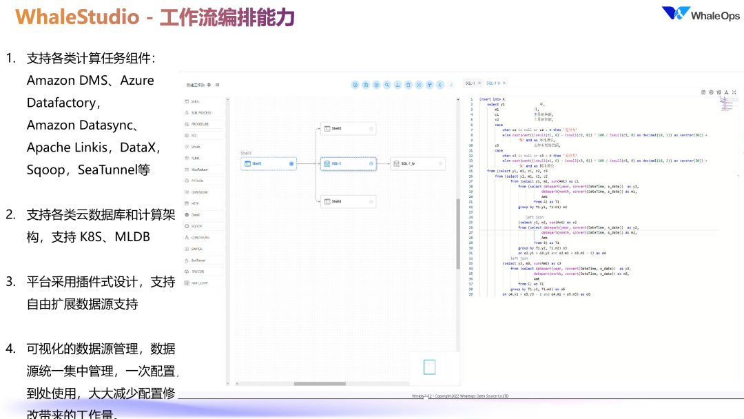 商业化版本通过 WhaleStudio 实现了一站式的开发、测试和运维闭环管理,提供了调度、数据同步、数据质量监控以及影响分析等完整功能。相比开源版本,商业版在 CDC 和数据源支持方面有显著增强,不仅支持更多数据源,还增加了 DDL 变更报警和延时告警,提升了数据开发与运维能力。