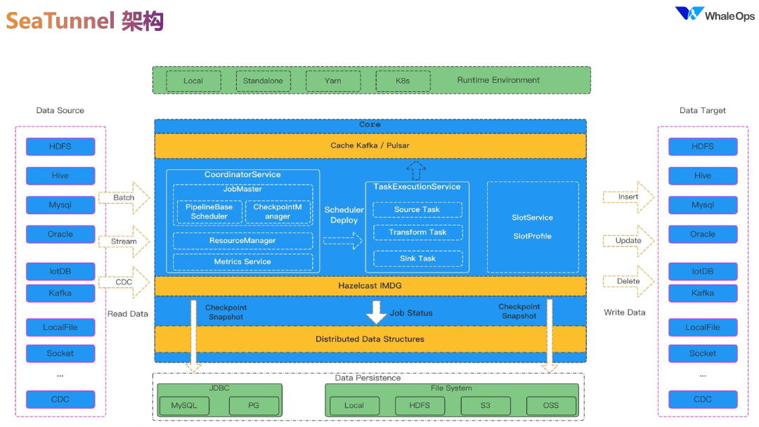 在技术架构方面,SeaTunnel 采用了无中心化的设计,架构中包括 Master 和 Worker 两个主要组件。Master 负责整体作业的管理和调度,而 Worker 则专注于执行具体的任务,包括数据的采集、转换和写入。每个任务的执行由 TaskExecutionService 管理,而 JobMaster 则负责对整个任务的管控,包括调度和监控任务状态。