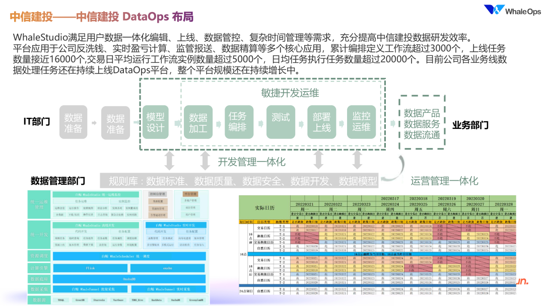 在应用中,中信建投从模型设计、数据加工、编排、测试、上线监控到运维实现了一体化的自动化管理,将 IT 部门的技术能力直接转换为业务部门的支持,全面提升了开发、运营和管理的效率。