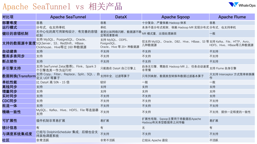 对比其他数据集成产品:与其他数据集成工具(如 DataX、Sqoop、Flume 等)相比,SeaTunnel 的部署相对更轻量级,且不依赖 Hadoop 生态系统。这使得 SeaTunnel 在复杂性和灵活性方面具备优势。此外,Flume 虽然在 Hadoop 体系下运作相对简单,但 SeaTunnel 仍然能够提供更灵活的部署方式。