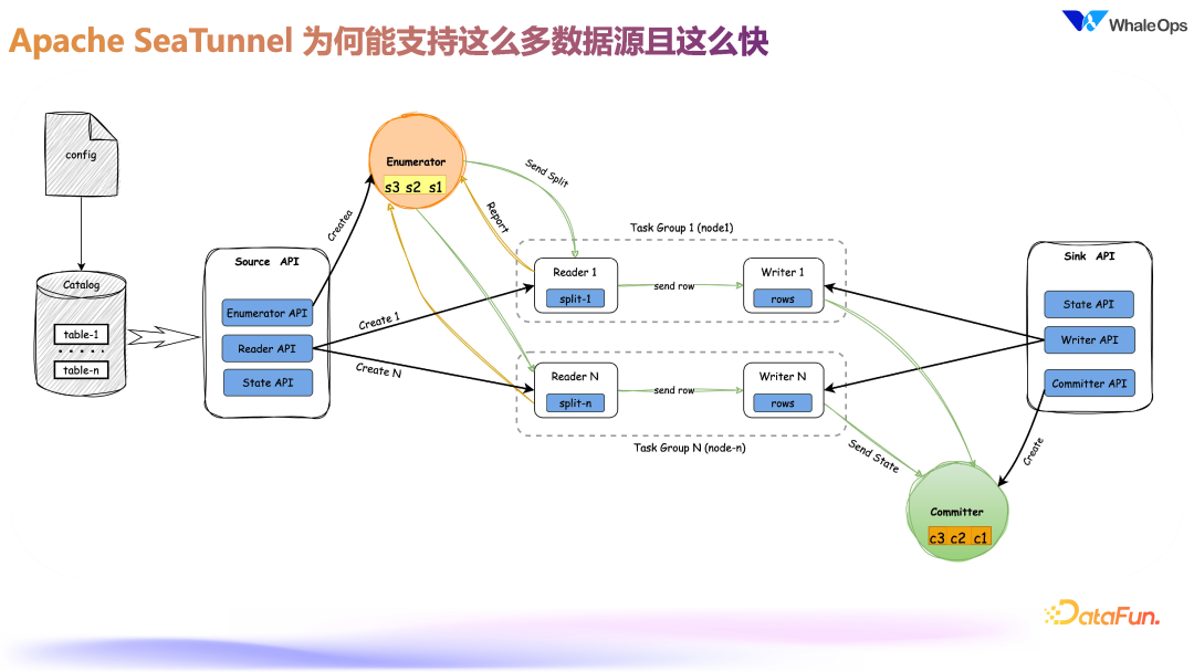并发管理与分片均匀性:在数据处理的中间环节,SeaTunnel 采用了并发和并行的管理机制,以确保分片数据能够均匀分布。同时,它通过抽样来分析各字段类型,例如识别某字段是字符串还是整数,以此决定分片同步的最佳机制,从而实现更高效的并发处理。