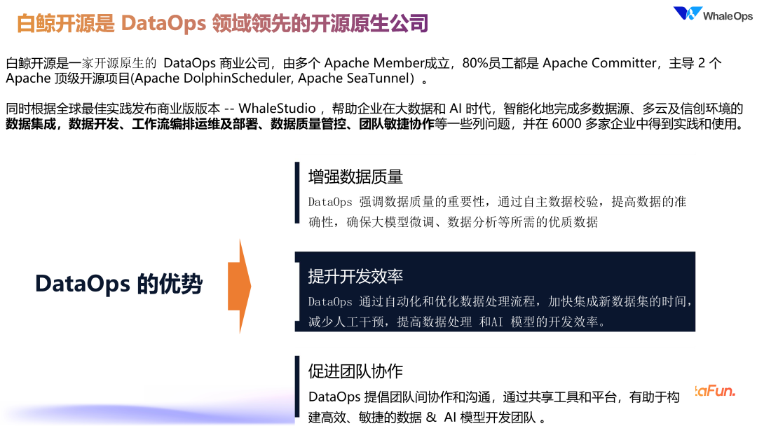 SeaTunnel。同时,白鲸也发布有对应的商业化版本——WhaleStudio,帮助企业在大数据和 AI 时代,智能化地解决多数据源、多云及信创环境下的数据集成、数据开发、工作流编排运维及部署、数据质量管控、团队敏捷协作等一系列问题,并已在 6000 多家企业中得到实践和使用。
