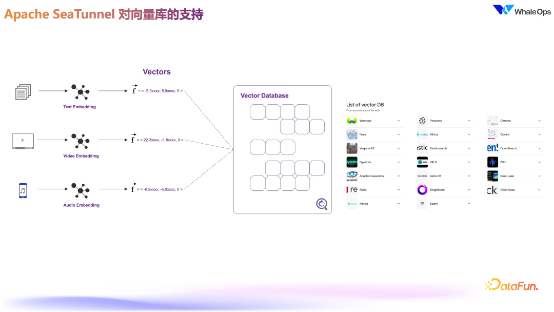 SeaTunnel 在 2023 年增加了对向量数据库的支持,这对于处理现代 AI 应用中的高维数据非常重要。向量类型的添加,使得用户可以更加高效地处理和转换向量数据,这一功能的实现离不开社区的贡献。向量数据库的引入,意味着 SeaTunnel 能够处理更多样化的数据源,并且能够将向量数据与其他类型的数据进行整合,进一步提升了数据集成的能力。
