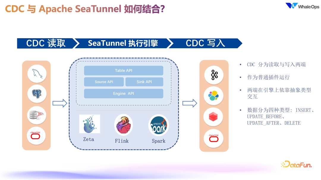 Data Capture)功能通过抽象设计实现了读取和写入端的数据变化捕捉,便于不同数据库之间的数据同步。CDC采用 SeaTunnel 的自定义数据类型,建立数据源与目标之间的字段映射,进行模型推演,使字段和类型在上下游匹配。数据分为insert、update(更新前后)和 delete 几种类型。
