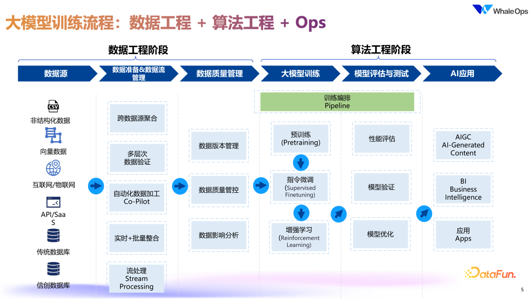 关于大模型的训练,数据工程不仅需要整合多种数据源(包括结构化、非结构化以及向量数据),还要实现跨源数据聚合和多层次的数据验证。这一过程涉及从网络爬虫到数据库、乃至国内的信创数据库等多样数据源的统一管理与聚合。同时,随着实时湖仓的快速发展,数据工程平台也在努力实现离线和实时的数据加工,以满足实时数据湖的需求,例如 Iceberg 等工具便在非结构化数据处理上表现突出。