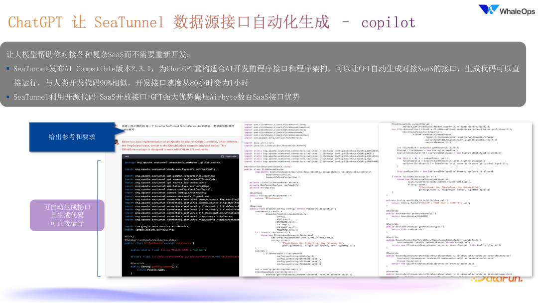 在数据连接器的扩展上,白鲸开源也利用 ChatGPT 进行优化开发。SeaTunnel 目前支持 160 种数据源,但为适应更多业务场景,需要开发更多连接器。白鲸开源尝试通过 GPT 自动生成接口,例如 HTTP 和 SaaS 接口相对简单,数据库接口较复杂,但仍能加快开发速度。此外,白鲸开源还结合 GPT 与 Copilot 来加强这一部分的开发效率,帮助 SeaTunnel 更好地支持多种数据源和业务场景。