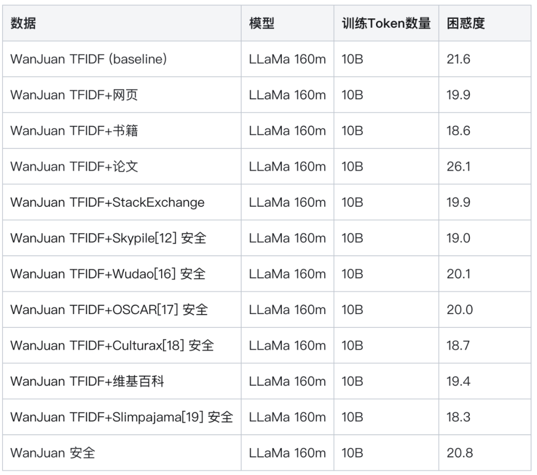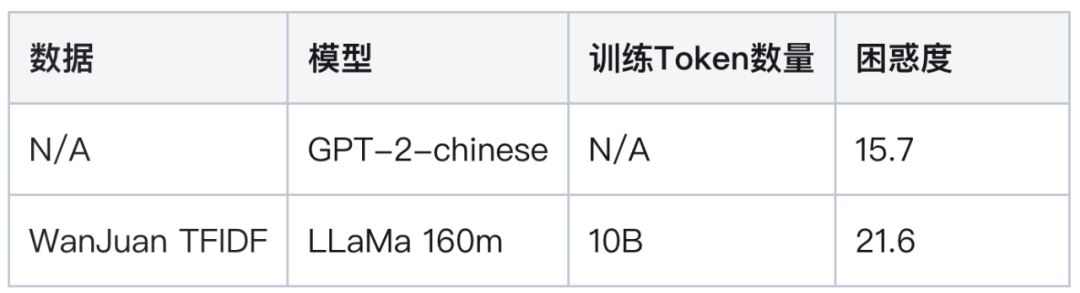 根据 Scaling Laws,困惑度和模型参数量高度相关,考虑到大部分实验都是在小参数量的模型上进行的,我们挑选了同样小参数量的 GPT-2 【13】原版和中文版本, 得到该参数量下模型的典型困惑度。4.2.2.数据baseline