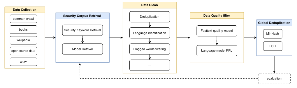 我们主要参考了BigCode的文本去重方案【10】,在spark集群上进行全量去重,该方案使用了MinHash LSH和分布式的联通块算法,以移除文档间Jaccard距离小于常数阈值的文档。经过去重后,总计减少了10%的数据量,同时在多次数据配比实验中,整体训练过程中测试集困惑度都更低,再一次验证了去重的有效性。在大模型项目从零到一的起步阶段,评测的重要性往往会被忽视。很多时候,收集完一批数据、模型训练完成、手工尝试几个问答后,就失去了方向,不知道下一步如何改进。我们认为,一个优秀的评测体系可以衡量数据/模型的有效性,加速和指导研发过程,需要投入足够的精力进行建设,所以本章我们会详细介绍一个服务于 SecCorpus 安全领域数据构建的评测框架。与以模型为主体的评测体系 (比如 SecBench) 不同,为了评估数据的质量, 我们构建了一个针对数据的评测体系,整体框架如下:- 在待评测的数据集上训练一个模型,通过模型的指标反映数据的质量,越高质量的数据理应使得模型达到更高的指标