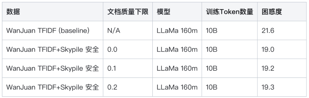 模型 baseline 一般都会选用简单成熟的方法,而我们构建数据的目的是提高安全能力,因此我们采用了传统的 TF-IDF 方法, 在开源 WanJuan【14】 数据集上召回了一批安全相关语料,约有3B token。通过人工检查,我们确认该方法产生的数据中的确包含了许多安全相关的语料,可以作为数据 baseline。之后我们用这批数据训练了 160m 参数量的 LLaMa 【15】架构模型,得到了数据 baseline 对应的困惑度。