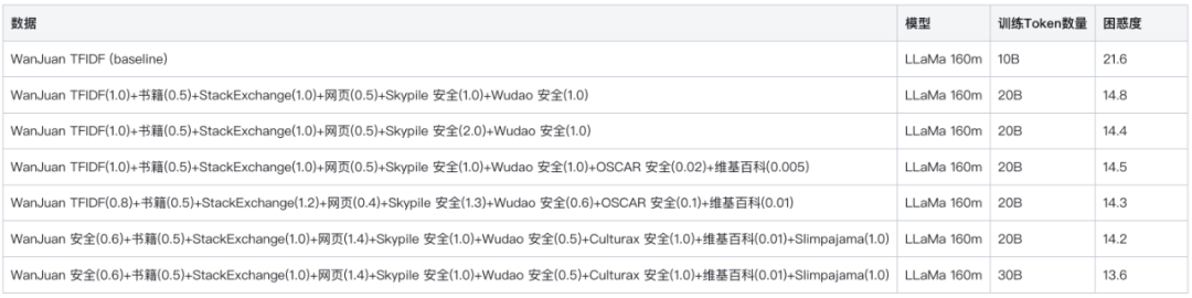 表格中数据括号表示该数据源与其他数据源的比例,整体数据都已去重。从实验中得到的结论是:- 适当地提高高质量数据权重可以进一步降低困惑度,但是需要注意不能重复太多次,否则会产生过拟合