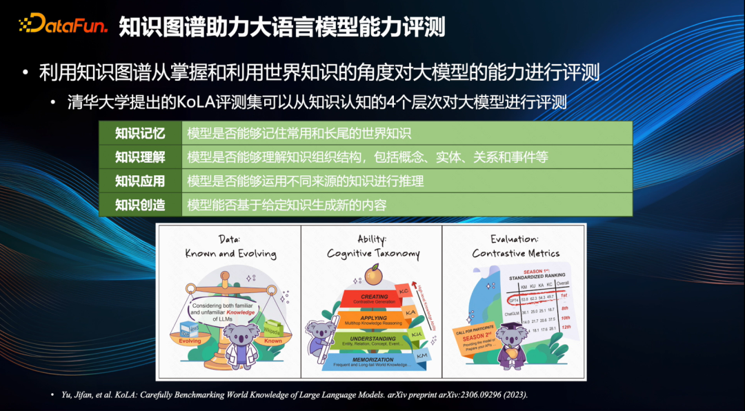 知识图谱对大模型的评测具有显著的助力,从掌握和利用世界知识的角度对大模型的能力进行全面的评测,典型的代表是清华大学提出的 KoLA 评测集[6],该评测集针对知识认知的四个层次,即知识记忆、知识理解、知识应用和知识创新,对大模型进行全面测试。