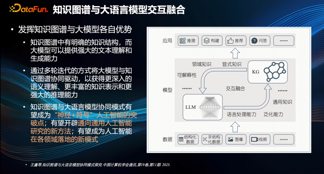 最后,分享基于当前的研究成果对未来知识图谱与大型模型交互融合的展望,由天津大学的王鑫老师提出[1]。