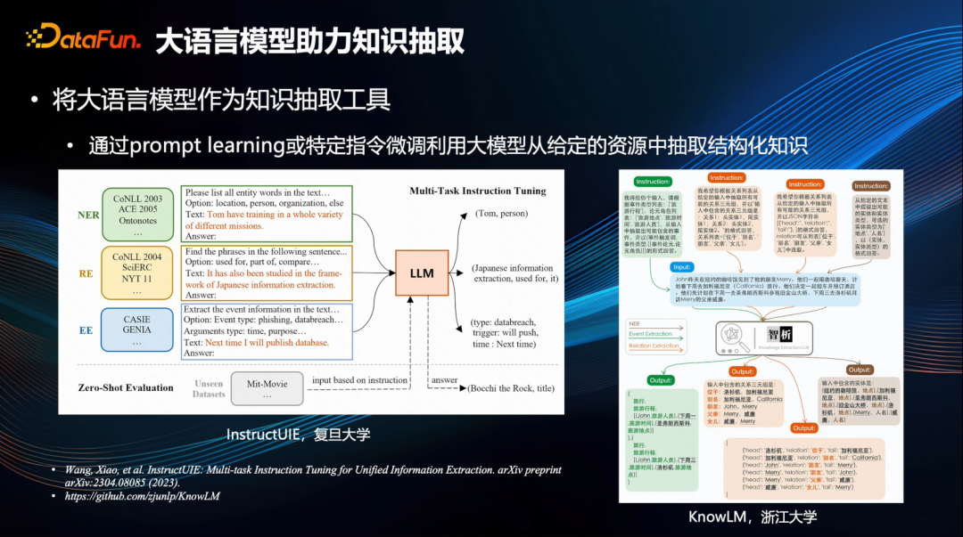 典型的例子像复旦大学的 InstructUIE[3]和浙江大学的 KnowLM[4]。用特定指令,调动大模型从给定资源里提取出有用的知识,完成各种各样的任务,比如实体提取、关系抽取、事件抽取等。当然,也可以针对这些指令做专门的 SFT(深度特征提取)微调,这样可以增强优化效果。换句话说,只要通过这些指令,就能在给定内容里轻松完成实体、关系等各种提取任务。