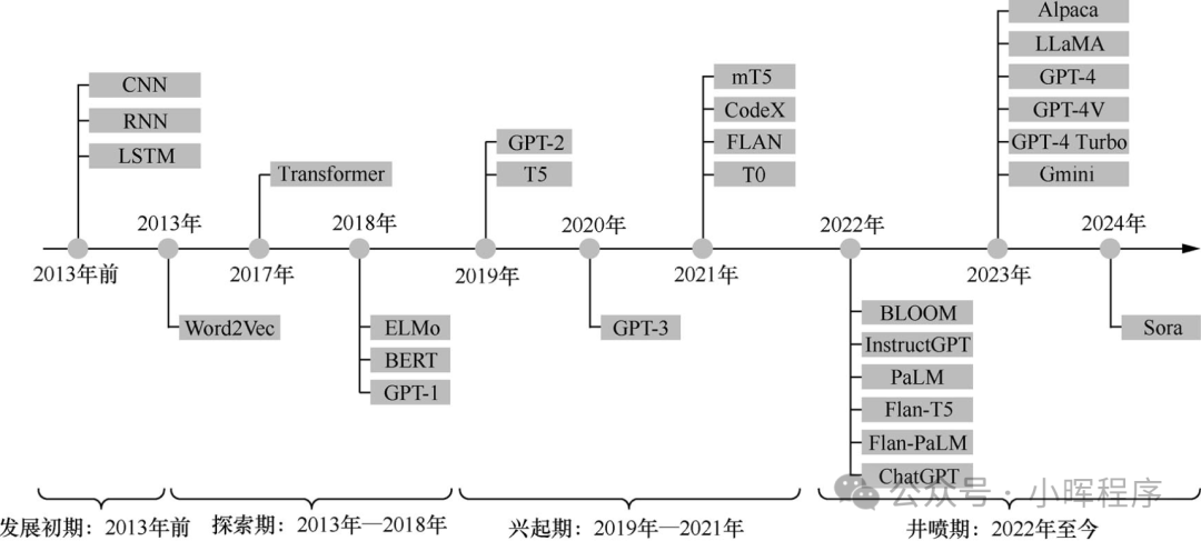 大模型的典型代表包括 GPT 系列(如 GPT-4)、PaLM、LLaMA、BERT、Stable Diffusion、MidJourney 等,覆盖自然语言处理(NLP)、计算机视觉(CV)及多模态(文本 + 图像 / 语音等)领域。目前在教育、医疗、金融、电商与零售、科研与工程等都有广泛的应用。下图是大模型技术的发展历程: