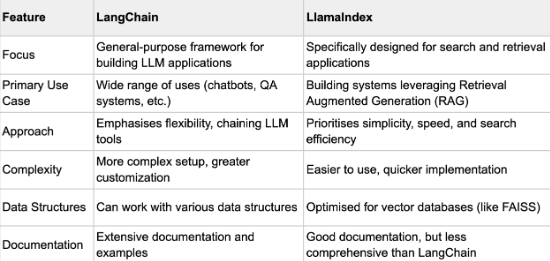 理解这些独特的方面可以帮助开发者为他们项目的具体需求选择合适的框架:- 如果正在构建一个以搜索和检索的效率和简便性为中心的应用,并且高性能和大规模数据处理至关重要,那么选择LlamaIndex将是明智之举。