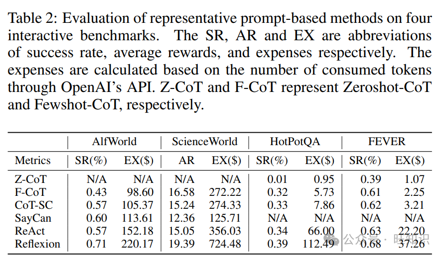 评估Agent的规划能力是研究领域的关键问题。在这里,我们调查了几种主流的基准测试方法,将它们归类为以下类型。交互式游戏环境:游戏环境可以根据Agent的行动提供实时的多模态反馈,包括文本和视觉反馈。目前最广泛使用的游戏环境是 Minecraft 4,其中Agent需要收集材料来创建工具以获得更多奖励。Agent创建的工具数量通常用作评估指标。另一个流行的类别是基于文本的交互环境,如 ALFWorld [Shridhar 等人,2020],ScienceWorld [Wang 等人,2022a] 等,其中Agent位于用自然语言描述的环境中,行动和位置有限。成功率或获得的奖励通常用作评估指标。与 Minecraft 相比,这些基于文本的交互环境通常更简单,反馈更直接,可行的行动更少。交互式检索环境:交互式检索环境模拟了人类在现实生活中进行信息检索和推理的过程。在这些环境中,Agent通常被允许与搜索引擎和其他网络服务进行交互,使用搜索关键词或执行点击、前进和后退操作等行动来获取更多信息,从而获得问题的答案或完成信息检索任务。常用的检索环境包括基于 Wikipedia 引擎的问答任务 [Yao 等人,2022](如 HotPotQA [Yang 等人,2018] 和 Fever [Thorne 等人,2018])和网络浏览任务以查找特定信息,包括 WebShop、Mind2Web [Deng 等人,2023] 和 WebArena [Zhou 等人,2023]。任务成功率通常用作指标。交互式编程环境:交互式编程环境模拟了程序员与计算机之间的交互,测试Agent在解决计算机相关问题方面的规划能力。在这些环境中,Agent需要与计算机交互,通过编写代码或指令来解决问题。它们会收到各种反馈,包括编译和运行时错误消息以及执行结果。流行的交互式编程环境涉及操作系统、数据库等问题,如 Agent Bench [Liu 等人,2023c],MiniWoB++ [Kim 等人,2023]。这些现有的交互环境大多缺乏细粒度评估,其中性能主要通过最终成功率来评估。此外,与现实世界场景通常有多种完成任务的路径不同,由于注释成本高昂,大多数模拟环境中通常只有一条“黄金”路径。实验。我们在四个基准上进行了实验,以验证代表性工作的性能,如表 2 所示。由于预算有限,我们实现了六种基于提示的方法,涵盖了任务分解、多路径选择和反思。至于基准,采用了 ALFWorld、ScienceWorld、HotPotQA 和 FEVER,涉及交互式游戏和问答基准。由于 ALFWorld 和 ScienceWorld 涉及较大的行动空间,零样本方法,即 ZeroShot-CoT,由于不了解行动空间而不适用。SayCan 通过将输出动作定位到行动空间中的价值函数来改进 CoT,这在 QA 任务中不适用,因为只有两个动作:SEARCH[KEYWORD] 和 LOOKUP[KEYWORD]。我们将价值函数设置为文本嵌入模型 bgesmall-en-v1.5 [Xiao 等人,2023]。我们为 CoT-SC 在每个步骤中获得了 3 个动作和 5 个答案。在 Reflexion 中重试的轮数设置为 1。我们使用 OpenAI 的 text-davinci-003 API 作为 LLM。