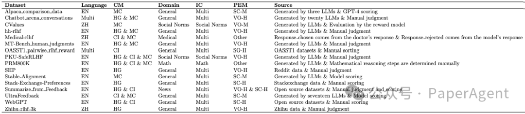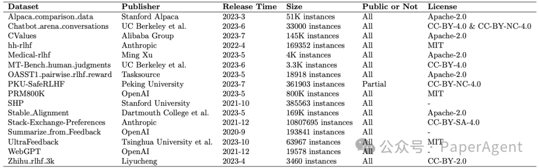 偏好数据集信息的总结。公开与否:“All”表示完全开源;“Partial”表示部分开源。“许可证”表示该数据集遵循某种协议。如果该数据集是基于其他数据集构建的,那么源数据集的许可证也必须遵守。