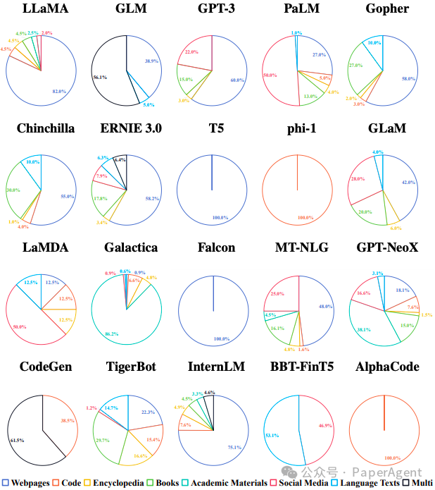 14个LLM使用的预训练语料库中数据类型的分布。每个饼图顶部显示LLM的名称,不同的颜色代表各种数据类型。
