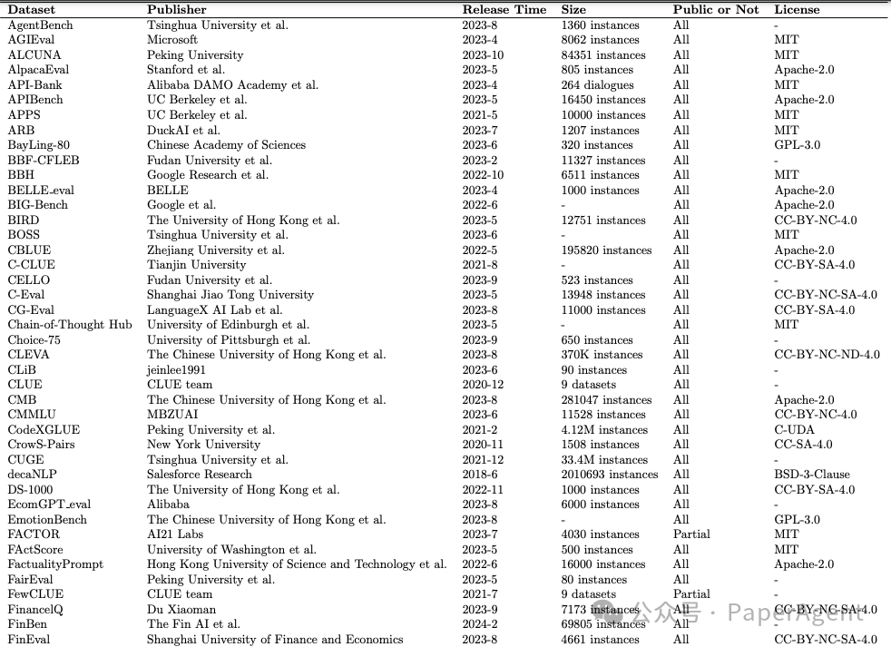 评估数据集信息的总结。公开与否:“All”表示完全开源;“Partial”表示部分开源;“Not”表示不开源。“许可证”表示该数据集遵循某种协议。如果该数据集是基于其他数据集构建的,那么源数据集的许可证也必须遵守。